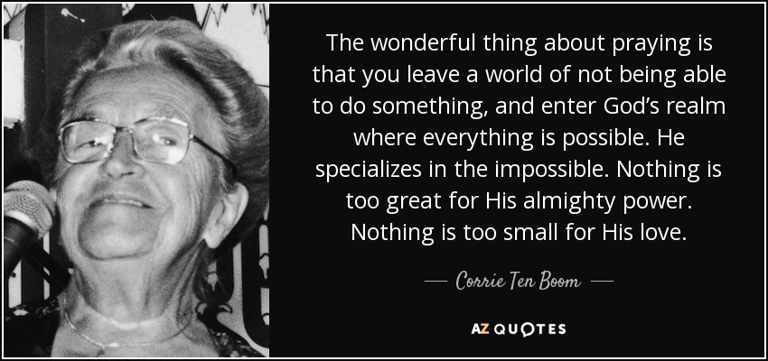 Finally, Betsie would die in captivity. Corrie would continue on, taking more responsibility in caring for the women around her. Early on in their time at Ravensbrück, Betsie reminded Corrie that God called them to be thankful in all circumstances, not just in lovely ones. Corrie couldn’t thank God for the fleas which infested their quarters. Later, Betsie observed that the guards rarely entered their barracks BECAUSE of the fleas, so they were free to have times of prayer and study. This was not wasted on Corrie as she began to see God at work in all their circumstances…and she gave thanks.